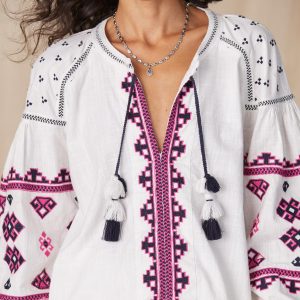 This breezy. boho-style top features allover embroidery. blouson sleeves. decorative stitching and tassels. Size down for a more true to size fit. Cotton. Hand wash. Imported. Exclusive. Sizes XS (0-2). S (4-6). M (8-10). L (12-14). XL (16-18). XXL (20-22). Approx. 24l.