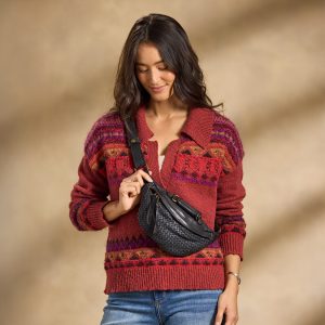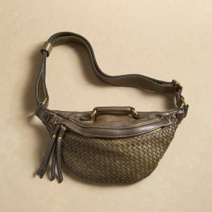 Woven leather and a decorative handle are the highlights of this handcrafted sling bag. which features a back zipper pocket. zipper closure and an adjustable strap. Leather. Italy. Exclusive. Approx. 1.5w x 6d x 11.75h.