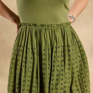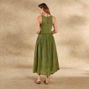 Soon to be your go-to casual ‘fit. our easy popover tank dress is detailed with mixed rib. woven eyelet and raw edge ruffles at the waistline. Side seam pockets. lined skirt. Cotton. Machine wash. Imported. Exclusive. Sizes XS (0?C2). S (4?C6). M (8?C10). L (12?C14). XL (16?C18). XXL (20?C22). Approx. 53l.
