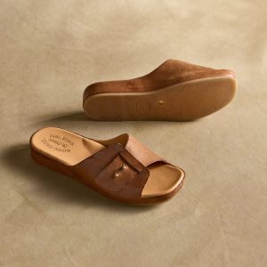 Go in comfort and style in these vegetable-tanned leather sandals with unique slip-through design straps and metal stud accents. Cork or rubber socks. rubber soles. Handcrafted. Imported. Whole sizes 6?C11. 1 heel.