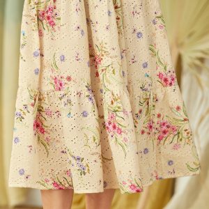 Enjoy the carefree charm of this easy. pull-over style. tiered dress with printed floral. eyelet details. puff sleeves. notch neckline and elastic waist and sleeves. Cotton. Hand wash. Imported. Exclusive. XS (0-2). S (4-6). M (8-10). L (12-14). XL (16-18). XXL (20-22). Approx. 51.5l.