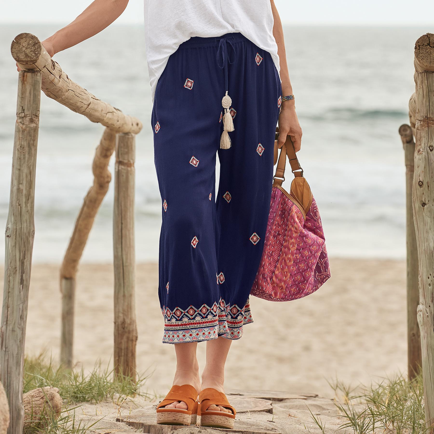 Our Niovi Pants are fashioned from the most delightful crinkle rayon crepe for the easiest. breeziest lightweight feel. In a cropped. wide-leg silhouette. with colorful allover embroidery and crochet tassel detail on elastic waistband tie. Great travel pants! Hand wash. Imported. Exclusive. Sizes XS (0?C2). S (4?C6). M (8?C10). L (12?C14). XL (16?C18). XXL (20?C22). 23 inseam.