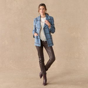 Our smart. brushed flannel plaid pea coat is soft. classic and beautiful. Double breasted. with faux horn buttons. patch pockets and a fun. floral-printed lining. Polyester. Dry clean. Imported. Exclusive. Sizes XS (0?C2). S (4?C6). M (8?C10). L (12?C14). XL (16?C18). XXL (20?C22). Approx. 29l.