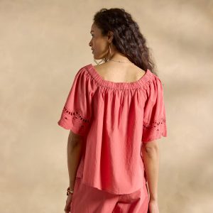 This relaxed. flowy blouse can be worn on or off the shoulder and features a smocked neckline with tasseled tie. cut-out details and embroidery. Cotton. Machine wash. Imported. Sizes XS (0-2). S (4-6). M (8-10). L (12-14). XL (16-18). XXL (20-22). Approx. 24.5l.